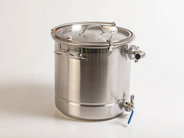 - Котёл 21 литр с тройным ферромагнитным дном (подходит для работы на любом типе нагревательных плит в том числе индукционной). В котёл встроены каналы наполнения (снизу, кламп 1/2 дюйма) и слива воды (сверху, кламп 1 дюйм).