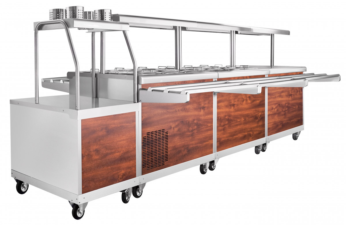 Прилавок холодильный высокотемпературный передвижной предназначен для хранения, демонстрации и раздачи холодных закусок, третьих блюд и охлажденных напитков потребителю в составе передвижной линии раздачи. Имеет поворотные колеса со стопором, особенно удобен при организации питания в гостиницах, ресторанах и организации буфетов и «шведских столов». Прилавок снабжен плавной регулировкой температуры охлаждаемой ванны от +1 до +10 С. Полка над прилавком служит для выкладки неохлаждаемых блюд или напитков и имеет лампу подсветки. Внизу — открытый нейтральный шкаф для кухонного инвентаря. Комплектуется набором гастроемкостей для хранения холодных закусок и салатов и складывающимися направляющими для подносов с двух сторон.