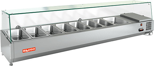 Настольная холодильная витрина HICOLD VRTG 1915 используется на предприятиях общественного питания и торговли для демонстрации, охлаждения и кратковременного хранения салатов, гарниров, закусок и других готовых блюд. Модель оснащена стеклянной надстройкой и специальным креплением для стола и предназначена для использования совместно с холодильным столом PZ4-11/GN. Изделие выполнено из нержавеющей стали.